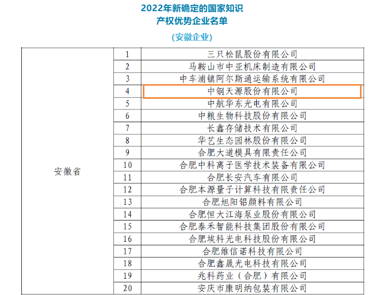 中鋼天源成功入選“2022年度國家知識(shí)產(chǎn)權(quán)優(yōu)勢(shì)企業(yè)”名單