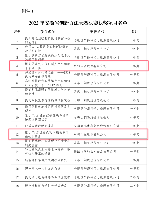 中鋼天源兩項(xiàng)目斬獲2022年安徽省創(chuàng)新方法大賽一等獎(jiǎng)