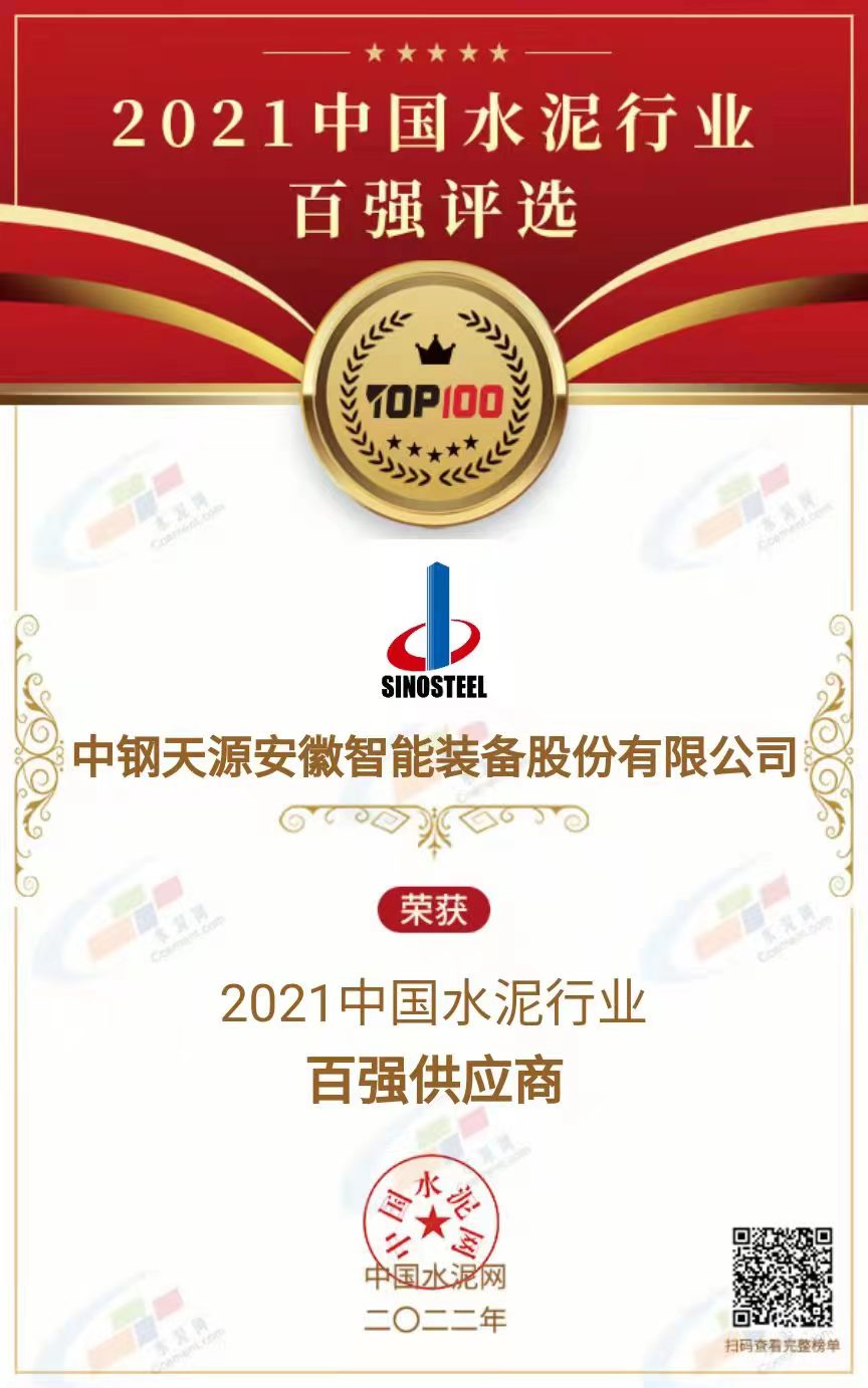 中鋼天源子公司獲“2021中國(guó)水泥行業(yè)百?gòu)?qiáng)供應(yīng)商”榮譽(yù)稱號(hào)